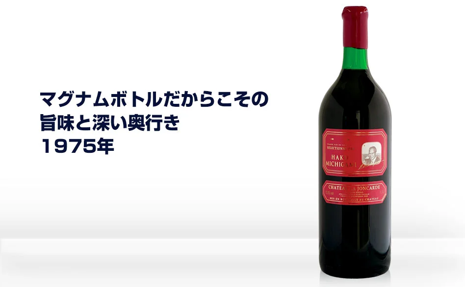 | シャトー・ラ・ジョンカード赤ラベル1975年マグナムボトル (赤ワイン/辛口/フルボディ) カベルネ・ソーヴィニヨン:75% メルロー:20% フラン・フラン5% | |
