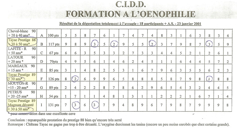 2001年に行われたフランスで最も権威のあるC.I.D.Dのブラインドコンテストでシャトー・タヤックすなわち、シャトー・ラ・ジョンカード赤ラベル 1989年のマグナムボトルが最高得点131Ptで1位に選ばれました。