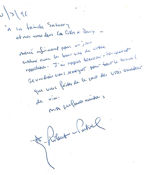 1991年3月 サチュルニー家(タヤック社/ジョンカードのオーナー)の皆様へ そしてコート・ド・ブールの友人の皆様へ 貴社のアペラシオンの素晴らしいワインを味わいながら、 素晴らしい一日を過ごすことができ、本当にありがとうございました。 おかげさまで、多くのことを学ぶことができました。 真のワイン愛好家のために尽力してくださっている皆様に、 心より感謝申し上げます。 心より敬意を表します。 ロバート・パーカー(タヤック社に贈られた直筆の手紙より)